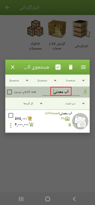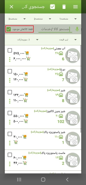 البته با فعال نمودن گزینه کالاهای موجود، فهرستی از کالاهایی که دارای موجودی هستند نمایش داده می‌شود. در زمان ثبت کالا اگر برای آن عکس ذخیره شده باشد در این قسمت امکان مشاهده آن وجود دارد.