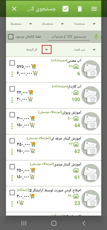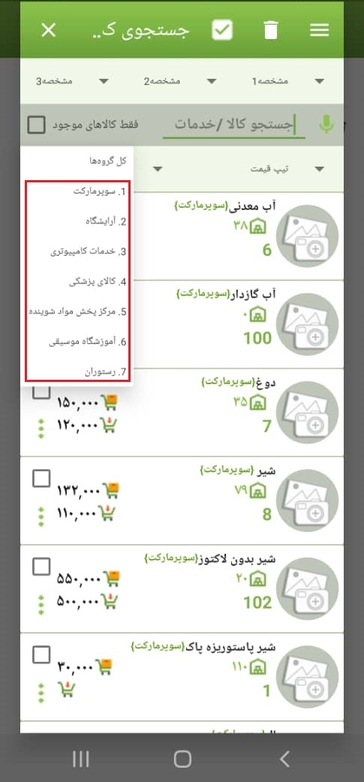 در برگه بازشده فهرستی از تمامی کالاهای ثبت‌شده در انبار موجود است. جهت انتخاب سریع کالا و خدمات می‌توانیم نام کالای موردنظر را به‌صورت دستی وارد یا آن را در لیست موجود جستجو نماییم. (با نوشتن فقط یک حرف از کالا، لیست کالا و خدماتی که حاوی حرف موردنظر است نمایش داده می‌شود که می‌توانیم به‌راحتی کالای موردنظر خود را انتخاب نماییم) همچنین در صورت فعال نمودن گزینه‌ی بر اساس گروه، لیست گروه کالا و خدمات فعال شده و می توانیم گروه موردنظر خود را انتخاب نماییم.