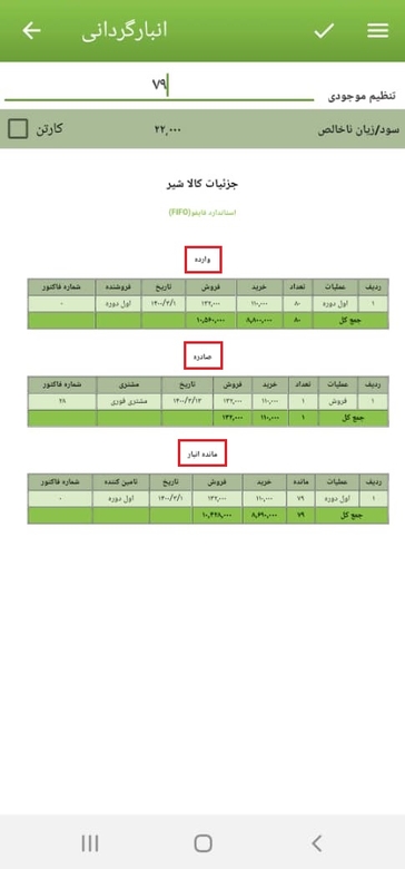 با انتخاب کالای موردنظر برگه جدیدی باز می‌شود که یک گزارش کامل از کالای انتخاب‌شده شامل اطلاعات وارده (موجودی اول دوره، خرید، برگشت از فروش)، صادره (فروش، برگشت از خرید، ضایعات) و مانده موجودی فعلی انبار، بر اساس تاریخ معاملات نمایش داده می‌شود. همچنین مبلغ سود و زیان ناخالص کالا را نیز در این قسمت می توانیم مشاهده نماییم.