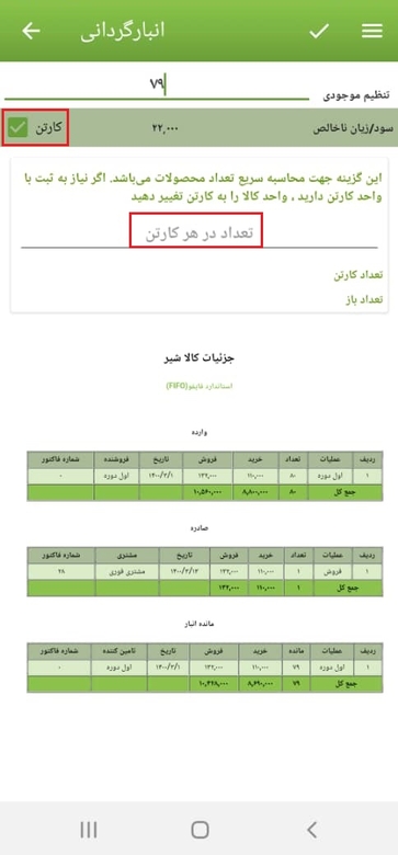 جهت محاسبه سریع تعداد محصولات می توانیم گزینه کارتن را فعال  و سپس تعداد  کالادر هر کارتن را  در کادر مربوطه وارد نماییم و به این صورت تعداد کارتن و تعداد باز محصولات به طور خودکار محاسبه خواهد شد. درصورتی‌که نیاز به ثبت محصولات با واحد کارتن داریم می‌توانیم واحد کالا را به کارتن تغییر دهیم.